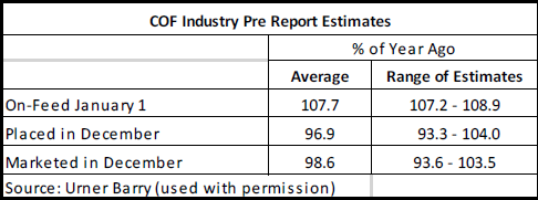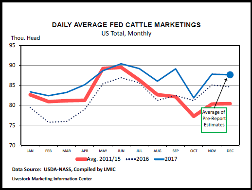 許多分析者預(yù)測12月份進(jìn)入育肥場的育肥牛數(shù)量同比會下降。2016年12月的存欄量是自2010年以來量最大的月份, 最近幾個(gè)月的存欄量也一直很大。 然而,如果在報(bào)告中會有一個(gè)出乎預(yù)料的數(shù)據(jù)的話,應(yīng)該是存欄量會高于報(bào)告前預(yù)測的平均水平(只有前一年的96.9%)如果12月的存欄量符合報(bào)告前預(yù)測的平均值,在2017年第四季度(10月-12月)進(jìn)入育肥場的牛總數(shù)同比增幅7.5%(433,000頭),是2012年以來同期最大量。