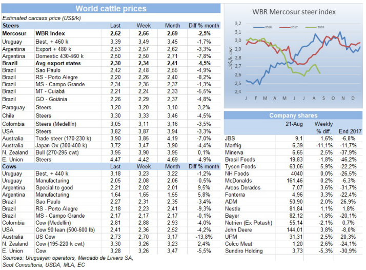 當(dāng)?shù)刎泿抛呷醭掷m(xù)影響活牛價(jià)格,以本地貨幣成交活牛的國(guó)家競(jìng)爭(zhēng)力增強(qiáng),南美共同市場(chǎng)閹牛指數(shù)本周又下跌了4美分到2.62美金/公斤,7月初以來(lái)最低。巴西雷亞爾對(duì)美金貶值了2.4%,阿根廷比索對(duì)美金貶值了1.2%,所以兩國(guó)美金牛價(jià)都下跌了4美分,巴西2.3美金/公斤,阿根廷2.53美金/公斤,烏拉圭市場(chǎng)形勢(shì)有所改變,猶太市場(chǎng)暫停,專注于481配額的谷飼牛肉生產(chǎn),巴拉圭牛價(jià)和上周一樣沒有變化。