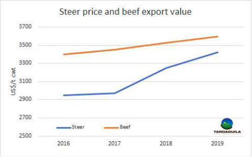 2017年國(guó)家肉類協(xié)會(huì)審查的16家工廠里有11家虧損,而現(xiàn)在的情況只會(huì)更糟,因?yàn)檎汲杀?span lang="EN-US">70-80%的活牛采購價(jià)格上漲的比牛肉銷售價(jià)格高出太多,2017年閹牛采購均價(jià)大約2970美金/噸,而平均出口價(jià)格為3452美金,差價(jià)約16%。2018年烏拉圭活牛市場(chǎng)由于更加缺牛,閹牛采購價(jià)格漲到3250美金/噸,而出口均價(jià)漲幅不大,因此差價(jià)縮小到9%。2019年至今牛價(jià)大幅上漲,閹牛采購均價(jià)漲到3420美金/噸,只比出口均價(jià)3593美金低不到5%。