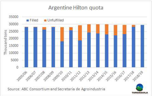 截止到上周,也就是離2018/19財(cái)政年不到20天的時(shí)間,阿根廷已經(jīng)發(fā)運(yùn)了29440噸希爾頓配額牛肉,幾乎馬上能完成29500噸的配額,這是自2008/09年以來阿根廷第一次能完成希爾頓配額,去年完成了配額的95%(28091噸)。2018/19年58%的牛肉去了德國(guó),20%去荷蘭,5%去意大利。同時(shí)截止到五月阿根廷發(fā)運(yùn)了7573噸481配額牛肉。