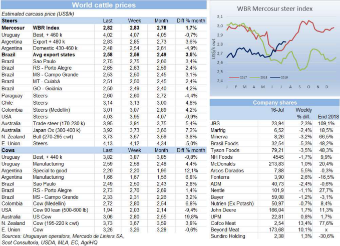 本周南方共同市場閹牛價格跌了1美分到2.82美金/公斤,原因主要是烏拉圭和巴西本地牛價的下跌,以及阿根廷比索的小幅貶值,不過巴西雷亞爾增值0.9%抵消了部分跌幅。