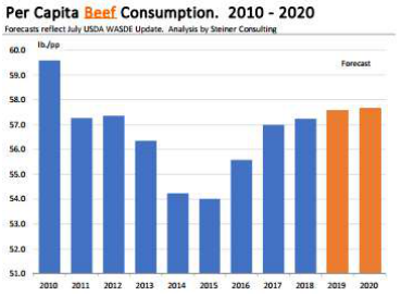 USDA在六月存欄報告出來之后對供應(yīng)/需求平衡表做了微調(diào),2019年預(yù)測牛肉產(chǎn)量調(diào)低了7500萬磅,主要原因是平均胴體重量比預(yù)期低,并且第三季度屠宰量也有下行的趨勢。產(chǎn)量的減少會被需求端的調(diào)整抵消一部分,進(jìn)口量將增加1000萬磅,出口量會減少1000萬磅,此外人均牛肉消費(fèi)量也被調(diào)低,僅會同比增長0.6%。不過USDA對2020年的預(yù)測數(shù)據(jù)并沒有進(jìn)行調(diào)整,而且雖然牛肉供應(yīng)量將減少,USDA還是把2019年閹牛價格預(yù)測調(diào)低了1.3%。