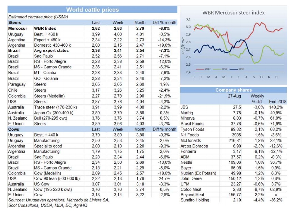 亞馬遜大火使巴西雷亞爾貶值,影響南方共同市場(chǎng)閹牛價(jià)格。本周世界牛肉周報(bào)南方市場(chǎng)閹牛指數(shù)下跌1美分,跌至2.62美元/公斤,創(chuàng)上年12月上半月以來(lái)新低。本周雷亞爾貶值約2.5%,美元兌雷亞爾匯率4.15,主要出口州育成閹牛胴體價(jià)下跌5美分,跌至2.36美元/公斤。巴西跌價(jià)被阿根廷價(jià)格上漲抵消,由于比索升值2%阿根廷價(jià)格上漲,閹牛出口價(jià)格按比索計(jì)也相應(yīng)上漲。按美元計(jì)閹牛出口價(jià)格上漲12美分至2.34美元/公斤,逼近巴西出口價(jià)格。巴拉圭和烏拉圭本周價(jià)格變化不大。