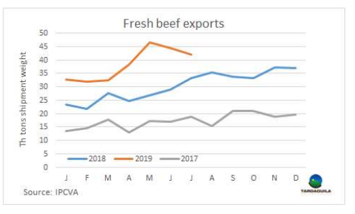 七月冷鮮和冷凍的牛肉和牛肉產(chǎn)品出口總量達(dá)42016噸,價(jià)值23230萬(wàn)美元。與2018年7月相比出口量增長(zhǎng)了26.8%,出口額增長(zhǎng)了33%。出口額大幅增長(zhǎng)是因?yàn)?span>2019年七月平均出口價(jià)格比2018年7月增長(zhǎng)了4.9%,冷凍無(wú)骨牛肉價(jià)格增長(zhǎng)了14.6%,增長(zhǎng)到4900美元/噸,冷鮮無(wú)骨牛肉價(jià)格同比增長(zhǎng)3.1%,增長(zhǎng)到8500美元/噸。