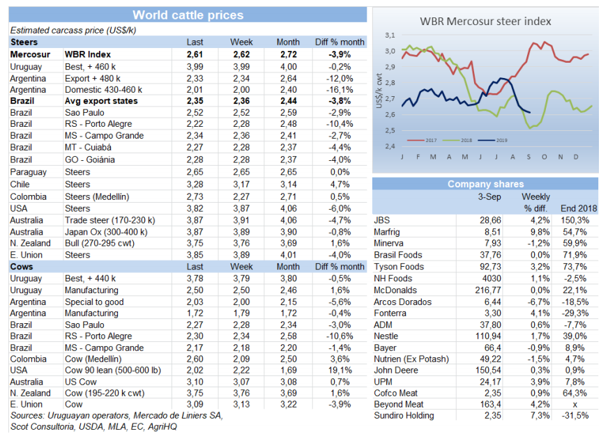 盡管阿根廷經(jīng)濟(jì)狀況微妙且因初選之后一系列情節(jié)變化無(wú)常。這標(biāo)志著相比于執(zhí)政黨,反對(duì)黨候選人Alberto Fernández Cristina和Fernández de Kirchner獲得了明顯偏愛(ài)。目前為止,肉類貿(mào)易鏈未受明顯影響。阿根廷這段時(shí)期經(jīng)歷的危機(jī)中限制購(gòu)買美元這一經(jīng)濟(jì)