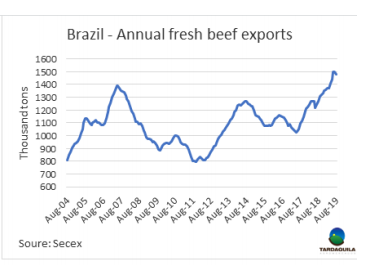 巴西鮮牛肉出口量仍處于較高水平,但不足以與過(guò)去幾年出口量持平,出口上漲趨勢(shì)可能達(dá)到了150萬(wàn)噸年度最高,此后可能輕微下行。八月巴西出口鮮牛肉126506噸,低于七月出口量12.9萬(wàn)噸和去年8月出口量14.4萬(wàn)噸。平均出口價(jià)格4178美元/噸,比七月出口價(jià)格增長(zhǎng)5%,創(chuàng)13個(gè)月以來(lái)新高。巴西八個(gè)月合計(jì)出口93.4萬(wàn)噸鮮牛肉,平均出口價(jià)3872美元/噸,出口量年度增長(zhǎng)15%,平均價(jià)格減少9.5%。