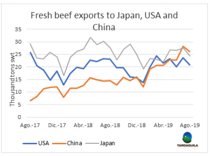 烏拉圭8月鮮牛肉出口比七月有所增長(zhǎng),已連續(xù)兩個(gè)月低于年平均水平。烏拉圭向國(guó)際市場(chǎng)輸出27472噸鮮牛肉,比七月增加了5400噸(25%),連續(xù)兩個(gè)月低于去年輸出量,比去年減少5%。中國(guó)從烏拉圭進(jìn)口19675噸,比七月增加2700噸,包括4350噸帶骨產(chǎn)品和15325噸去骨產(chǎn)品。去骨裝船產(chǎn)品均價(jià)5152美元/噸,略高于7月份,與今年第一季度相比持續(xù)增長(zhǎng)(約4500美元/噸)。美國(guó)是又一相對(duì)重要的出口目的地,冷凍牛肉銷往美國(guó)1738噸。本月出口其他國(guó)家不到500噸。