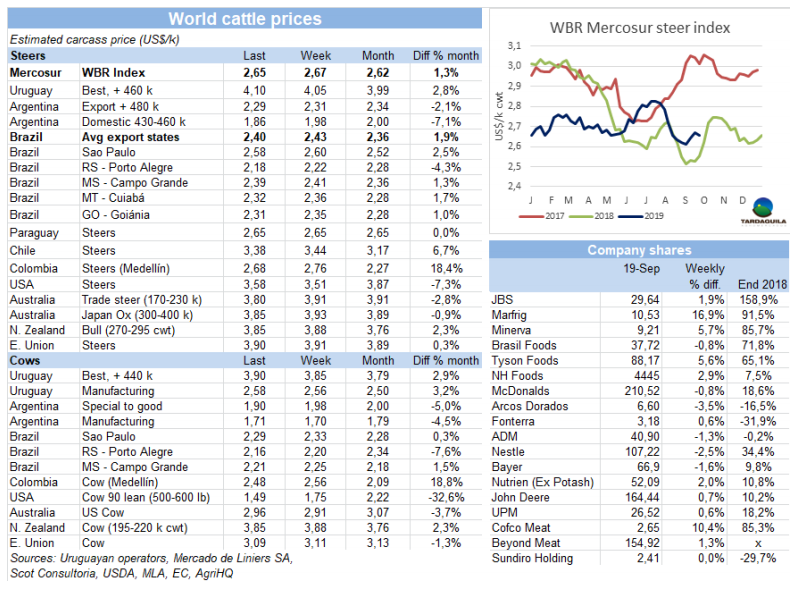 (3998頭),Las Piedras (3644頭),NH-BPU(3637)。Marfrig三家工廠共屠宰9519頭,Minerva兩廠共屠宰7513頭。9月截止目前,共屠宰122334頭牛,比去年同期減少7.3%,預(yù)計(jì)本月屠宰量將近17萬(wàn)頭,比2018年9月減少1萬(wàn)頭,年屠宰量的差距將縮小,過(guò)去三個(gè)月屠宰量減少1.9萬(wàn)-2.9萬(wàn)頭。