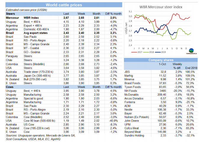 新廠被授權(quán)準(zhǔn)入中國使南方共同市場對中國牛肉出口凈重每月至少增長4萬噸。中國授權(quán)準(zhǔn)入17家巴西新廠,8家阿根廷新廠,1家烏拉圭新廠,現(xiàn)在主要的局限是冷凍能力。這也是之前為了在未來幾個月內(nèi)增加對中國產(chǎn)量進(jìn)行投資的原因。預(yù)計巴西對中國出口量將增加一倍,今年每月直接出口到中國約3萬噸,8月增長至3.7萬噸,對冷凍能力的投資完成后,每月出口將達(dá)到7萬噸。其中一部分來自水漂貨市場,另一部分來自目前輸出的其他目的地,如中東,智利。今年截至目前,阿根廷平均每月對中國出口2.9萬-3萬噸,新工廠被授權(quán)后可達(dá)4萬噸,也需要投資改善冷凍條件。烏拉圭工廠屬于中小型,考慮到其持股人是中國公司,也可以供一些量。2019年前八個月南方共同市場對中國平均每月出口約7.5萬噸,冷凍條件的投資一旦完成,加上準(zhǔn)入的新工廠,每月出口量將攀升至11萬-12萬噸,占出口總量的55%-57%。