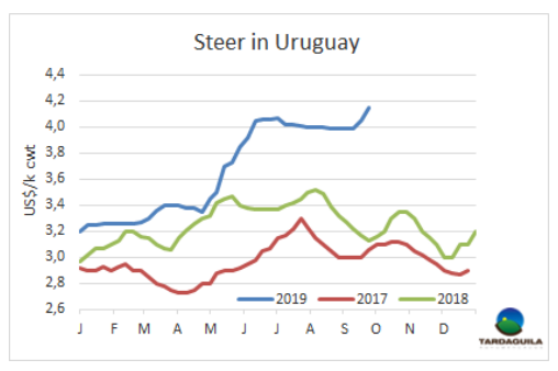 烏拉圭育成牛和后備牛價格仍反映出供應(yīng)短缺的問題,需求端為采購施加壓力。工廠繼續(xù)以高價在國外市場成交,尤其是中國。這促使工廠收購一切可用的牛。燕麥和苜蓿田的草料產(chǎn)量尚未達(dá)到預(yù)期,因為三月處于干旱季節(jié),隨后是降雨和洪水,嚴(yán)峻的霜凍使草料產(chǎn)量下降,直至九月下旬冬季結(jié)束。在沿海地區(qū),今年可供屠宰的牛只增多,在燒掉未達(dá)到預(yù)期產(chǎn)量的燕麥田后,播種夏季作物,主要是大豆。大型加工廠提高報價以保證牛只數(shù)量,從昨天開始?xì)W洲市場的481配額的屠宰結(jié)束后,他們現(xiàn)在集中精力完成其他目的地(主要是中國)的出口。最大的問題就是牛只很少,小廠被迫效法,但要比大廠投入更多。特種草飼牛胴體價格4.15美元/公斤,良種母牛3.95美元/公斤,幼母牛4.05美元/公斤,所有參考價均包含運費,45天內(nèi)付款。本周的大雨將繼續(xù)延遲牛的育肥,一旦供應(yīng)跟上,市場將趨于穩(wěn)定。中國為一月新年假期的額外需求采購結(jié)束后,價格可能會下降。