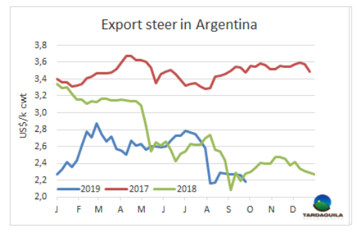 在阿根廷的出口目的地中,中國不可撼動的地位日益突出。2019年1月至8月,中國采購牛肉233757噸,是2018年前八個月采購量的兩倍,占阿根廷牛肉總出口量的72.6%。這一采購量是采購量排名第二國家智利的9倍,智利在此期間采購量20716噸。以色列和德國排在3、4位,分別占出口總量的5.4%和5.0%,俄羅斯遠(yuǎn)居其后,占出口總量的2.6%。
