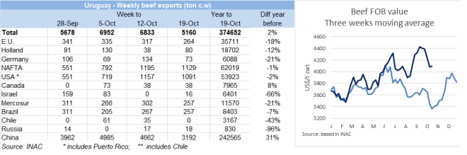 美麗華旗下屠宰場(chǎng)Carrasco將于11月4日(下周一)恢復(fù)屠宰活動(dòng)。因此美麗華在烏拉圭的三家工廠有兩家進(jìn)行屠宰活動(dòng)。目前美麗華Canelones廠仍然沒(méi)有生產(chǎn)活動(dòng)。