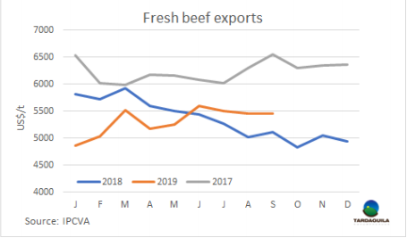 9月冷鮮、冷凍和加工類(lèi)牛肉出口達(dá)54729噸,價(jià)值約2.98億美元。這些數(shù)字表明了出口量同比增長(zhǎng)61.6%,收益增長(zhǎng)了72.4%,這兩種計(jì)量方式的差異是因?yàn)槌隹趦r(jià)格的上漲,年度增長(zhǎng)6.7%,出口價(jià)格上漲在冷鮮去骨產(chǎn)品和冷凍去骨產(chǎn)品中表現(xiàn)并不均衡。9月去骨冷鮮產(chǎn)品報(bào)價(jià)8700美元/噸,比2018年9月上漲1.5%,冷凍去骨產(chǎn)品達(dá)5000美元/噸離岸價(jià),比去年增長(zhǎng)22.5%。