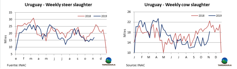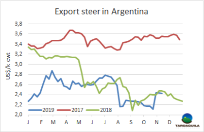 大選結(jié)果確定和貨幣兌換管控過后出口價(jià)格仍然堅(jiān)挺。英國純種閹牛報(bào)價(jià)140-145比索/公斤,印度串種閹牛報(bào)價(jià)136-140比索/公斤,母牛價(jià)格上漲趨勢(shì)受中國需求影響,仍保持上漲趨勢(shì):特種和良種母牛報(bào)價(jià)140-145比索/公斤,工業(yè)母牛報(bào)價(jià)125-130比索/公斤。