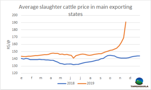 供應(yīng)短缺不僅在活牛價格上體現(xiàn)出來,也體現(xiàn)在出口量上。11月前4周15個工作日內(nèi)巴西出口牛肉90514噸,照此推測到月底將達到12萬噸,遠低于10月出口量(16萬噸),也低于2018年11月出口量(13萬噸)。本月截至今日平均出口價格4868美元/公斤,月增長9%,年度同比增長22%。