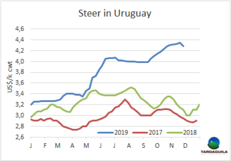 10月閹牛類產(chǎn)品價值1279美元/頭,比上月增長6美元,從7月的1210美元/頭連續(xù)四個月保持上漲趨勢。閹牛類產(chǎn)品價值是指一頭體重480公斤,產(chǎn)出率54%的英國純種閹?;螂s交閹牛產(chǎn)出的所有產(chǎn)品的平均價值的總和。烏拉圭肉協(xié)稱閹牛類產(chǎn)品價值的增長是因為閹牛部位肉出口價值的增長和國內(nèi)市場胴體價格的上漲,部分抵消了牛副和鮮皮價格的下跌。換算成烏拉圭比索,2019年10月閹牛類價值和工廠閹牛采購價格達到自2008年11月11年以來最高。