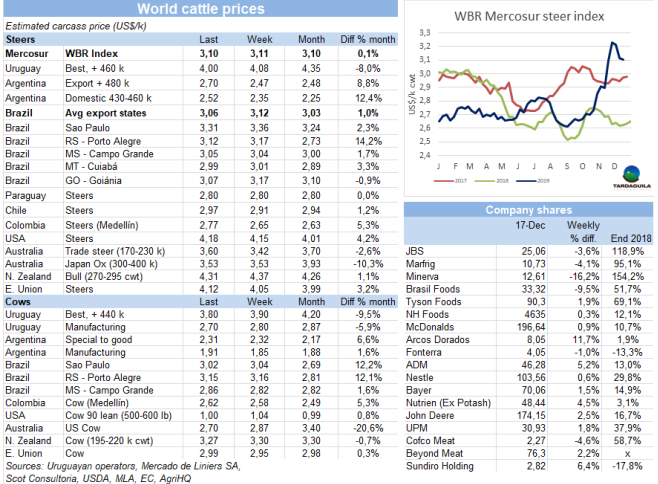 巴西和烏拉圭繼續(xù)壓低當(dāng)?shù)赜膳r格,而阿根廷稅率的變化抬高了閹牛出口價格。因此,南方共同市場閹牛價格指數(shù)下降1美分,胴體價格下降至3.1美元/公斤。巴西本周凈差額再次下降,盡管近幾天顯示出穩(wěn)定趨勢,本周雷亞爾升值2%不足以扭轉(zhuǎn)育成牛價格的下跌,價格按美元計下跌6美分,胴體價格下降至3.06美元/公斤。烏拉圭閹牛價格持續(xù)下跌,報價4美元/公斤,并將繼續(xù)下跌。阿根廷出口閹牛比索價格在穩(wěn)定了幾周之后本周開始上漲。我們必須考慮到稅率上漲使出口同等數(shù)量的肉變得更加昂貴。本周參考價格指數(shù)上漲23美分,胴體價格上漲至2.7美元/公斤。巴拉圭育成牛胴體價格連續(xù)第五周保持2.8美元/公斤。