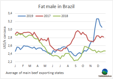 本周在巴西主要的活牛交易市場育成牛價格再次出現(xiàn)下行,近幾日有穩(wěn)定跡象,有些地區(qū)甚至出現(xiàn)上行修正。牛只供應(yīng)有限,需求也是一樣,預(yù)計接下來幾天會繼續(xù)縮減,因為一些工廠在今年年末和2020年年初停止屠宰活動。圣保羅期貨市場第一批期貨(12月到2月)價格上漲,尤其是12月的合同價格上漲了6.6雷亞爾/15公斤,2020年年中以后仍然呈下行趨勢。批發(fā)市場牛肉價格繼續(xù)下跌。