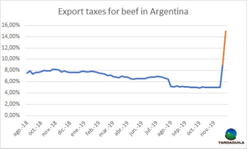 上任一周以來,宣布一系列聲明后,基什內(nèi)爾政府阿爾貝托·費爾南德斯希望國會今天批準(zhǔn)《經(jīng)濟(jì)緊急狀態(tài)法》草案,該草案于昨日在議會上提交,將賦予他非凡的權(quán)力,在許多微妙的問題上避免立法的干預(yù)。此前,上周六發(fā)布了一項法令通過更改百分比,修改了前任政府2018年9月恢復(fù)出口加征關(guān)稅的規(guī)則,以前每出口1美元征收一定數(shù)量阿根廷比索的稅。(每出口1美元牛肉征收3阿根廷比索)。整體性的規(guī)則還未明確,大致分析的結(jié)果是牛肉的有效出口稅被定在9%,比15個月前打算加征的8%高1個百分點,考慮到比索貶值的影響,出口稅的數(shù)額比上周增長了4.2個百分點。該措施導(dǎo)致大豆出口稅率達(dá)30%,糧食和其他油籽稅率為12%。昨天,所有這些推理都變得抽象,因為在政府希望今天獲得批準(zhǔn)的經(jīng)濟(jì)緊急措施系列計劃中,對大豆的出口稅改為了33%,對2018年9月2日(馬克里重新征收出口稅之前)沒有涉及的產(chǎn)品,例如小麥,玉米和牛肉征收出口稅15%。根據(jù)當(dāng)前的閹牛出口價格,按照稅率增長9%計算,每公斤胴體將被征收額外的17美分,如果稅率變?yōu)?span>15%,進(jìn)口稅將增長約38美分。