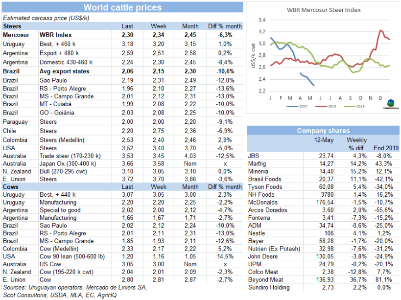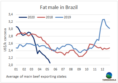與出口到國(guó)內(nèi)市場(chǎng)的工廠相比,直接出口到中國(guó)市場(chǎng)的肉類加工廠要多花10雷亞爾采購(gòu)出口至中國(guó)的適齡牛(30個(gè)月齡以下),這反映了出口相對(duì)于國(guó)內(nèi)需求的卓越競(jìng)爭(zhēng)力。這主要是由于雷亞爾疲軟,昨天雷亞爾兌美元匯率為5.87。在上周日母親節(jié)(通常在每個(gè)月的月初)出現(xiàn)額外需求之后,巴西國(guó)內(nèi)市場(chǎng)對(duì)牛肉興趣不大,新冠疫情危機(jī)中,消費(fèi)者趨向于選擇更便宜的蛋白質(zhì)。圣保羅育成牛參考價(jià)193雷亞爾/15公斤,較上周下跌1美分。預(yù)定時(shí)間拉長(zhǎng)至9天左右,其他州,例如米納斯吉拉斯,預(yù)定時(shí)間拉長(zhǎng)至11天。不同地區(qū)價(jià)格走勢(shì)不同,戈亞尼亞州價(jià)格有回漲,參考價(jià)在178.5雷亞爾/15公斤。