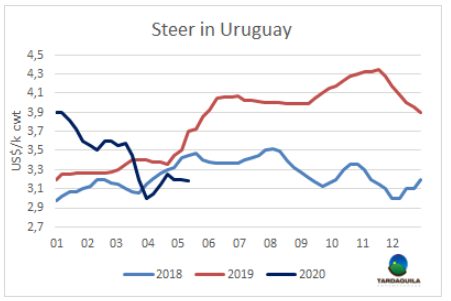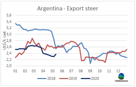 2020年開端南美國(guó)家屠宰量下降,但這并不意味著出口量減少。相反,受新冠肺炎疫情影響,相對(duì)于國(guó)內(nèi)市場(chǎng)的疲軟,出口活動(dòng)獲得了有競(jìng)爭(zhēng)力的收益,出口量保持堅(jiān)挺。今年前四個(gè)月,南方共同市場(chǎng)牛只屠宰量約1270萬(wàn)頭,較2019年同期減少90萬(wàn)頭,減少6.6%。烏拉圭牛屠宰量減少最嚴(yán)重,減少了23.1萬(wàn)頭,約28%。屠宰量占比最大的是巴西,巴西經(jīng)過認(rèn)證的肉類工廠牛只屠宰量706萬(wàn)頭,較2019年同期減少95.5萬(wàn)頭,約12%。阿根廷和巴拉圭屠宰量增長(zhǎng)部分抵消屠宰量的下降。在為遏制新冠病毒擴(kuò)散采取的措施給給國(guó)際貿(mào)易帶來(lái)了極大的復(fù)雜性的情況下,產(chǎn)量的下降并沒有阻止出口保持堅(jiān)挺。1-4月,南方共同市場(chǎng)牛肉出口量79萬(wàn)噸,高出2019年同期出口量(77萬(wàn)噸)。出口相對(duì)國(guó)內(nèi)市場(chǎng)在盈利方面的強(qiáng)競(jìng)爭(zhēng)力成為巴西出口趨勢(shì)得以保持的主要原因。巴西肉類加工廠以雷亞爾買牛,那些做國(guó)內(nèi)市場(chǎng)的以雷亞爾賣牛肉,以滿足巴西國(guó)內(nèi)消費(fèi)者的需求。相反,出口工廠以美元賣牛肉,美元的價(jià)值一天比一天高。自年初以來(lái),巴西貨幣的貶值幅度一直在40%上下波動(dòng)。因此,盡管牛肉產(chǎn)量下降,巴西出口商海外銷售發(fā)運(yùn)量46.7萬(wàn)噸,較2019年1-4月增長(zhǎng)5%。阿根廷情況一樣,盡管出口商必須以官方匯率(較平行市場(chǎng)低很多)將收到的美元兌換成比索,并且付9%的出口稅,阿根廷1-4月出口量小幅增長(zhǎng),上漲了10%,阿根廷1-4月屠宰量上漲了6%。烏拉圭情況類似,今年截至目前,出口量的降幅小于屠宰量的降幅,分別為(20%和28%),屠宰量的減少被進(jìn)口量的增長(zhǎng)抵消。巴拉圭出口量和屠宰量的漲幅相當(dāng),3%-4%??傊厦赖貐^(qū)作為世界最大的牛肉供應(yīng)地區(qū),保持堅(jiān)挺的銷量,盡管新冠肺炎疫情給需求端帶來(lái)困境,動(dòng)物蛋白需求旺盛,尤其是亞洲大陸,更精確說(shuō)是中國(guó)。
