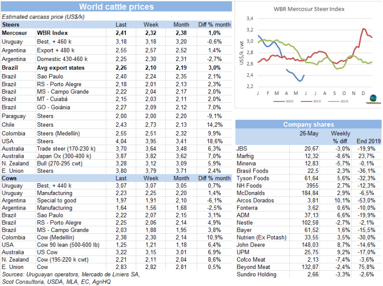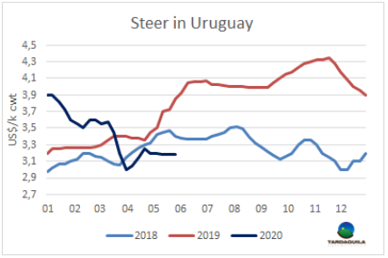 在公布四月的閹牛類型價(jià)值數(shù)據(jù)時(shí),烏拉圭肉協(xié)做了一些澄清,強(qiáng)調(diào)“在當(dāng)前條件下,平均工廠增值價(jià)值無法覆蓋工廠成本”。4月閹牛類型價(jià)值每頭較3月下跌了85美元,下跌至1162美元,達(dá)2019年5月以來最低。2019年5月中國(guó)進(jìn)口價(jià)格開始飆升。牛只的平均采購(gòu)價(jià)格急劇下降,每頭降了120美元,降至835美元。因此,每頭牛的增值價(jià)值(兩者之間的差額,即工廠必須支付的其他成本,并最終獲得的收益)增加了35美元,至327美元,這是自2017年12月以來的最高水平。烏拉圭肉協(xié)提醒,閹牛類型價(jià)值只反應(yīng)“計(jì)算時(shí)可用的統(tǒng)計(jì)數(shù)據(jù),不包括一些出口合同中額外的變化?!边@里是歐洲進(jìn)口商與一些工廠就3月成交的481配額合同議價(jià)的情況。此外,烏拉圭肉協(xié)還稱,屠宰活動(dòng)極少時(shí)銷售額同樣不足以支撐成本。閹牛類型價(jià)值的降低是由于出口部位肉、牛雜碎、牛副、鮮皮等價(jià)格下跌,國(guó)內(nèi)市場(chǎng)胴體價(jià)格大體保持不變(所有價(jià)格按美元計(jì))閹牛類型價(jià)值是對(duì)480公斤活重出成率54%的英國(guó)純種閹牛或其雜交品種所產(chǎn)出的所有產(chǎn)品的平均價(jià)值總和的估算。