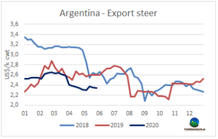 閹牛出口價(jià)格保持前兩周的水平,最好的英國(guó)純種閹牛保持155-160比索/公斤,印度串種閹牛保持150-155比索/公斤,特優(yōu)種母牛138-142比索/公斤,工業(yè)母牛下跌1比索至119-129比索/公斤。