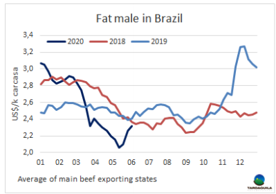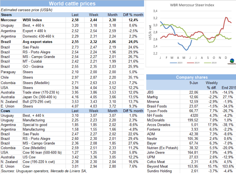 本周南方共同市場閹牛價格急劇上漲,達到三月中旬疫情剛剛開始在南美地區(qū)蔓延時的價格水平。本周南方共同市場閹牛價格上漲14美分,上漲至2.58美元/公斤。巴西活牛價格上漲是主導因素,但巴西不是牛價上漲唯一的原因。本周雷亞爾增值6.7%,較5月中增值17%。經濟危機期間通貨膨脹急劇下降,給貨幣當局大幅降低市場基準利率的空間。巴西主要出口州育成牛價格上漲了5.3雷亞爾/15公斤,上漲至187.1雷亞爾/15公斤,達3月末以來最高。巴拉圭牛價在連續(xù)5周穩(wěn)定之后也有上漲,烏拉圭市場堅挺,只有阿根廷牛價受匯率變化的影響有所下跌,但出口閹牛價格穩(wěn)定在160比索/公斤。