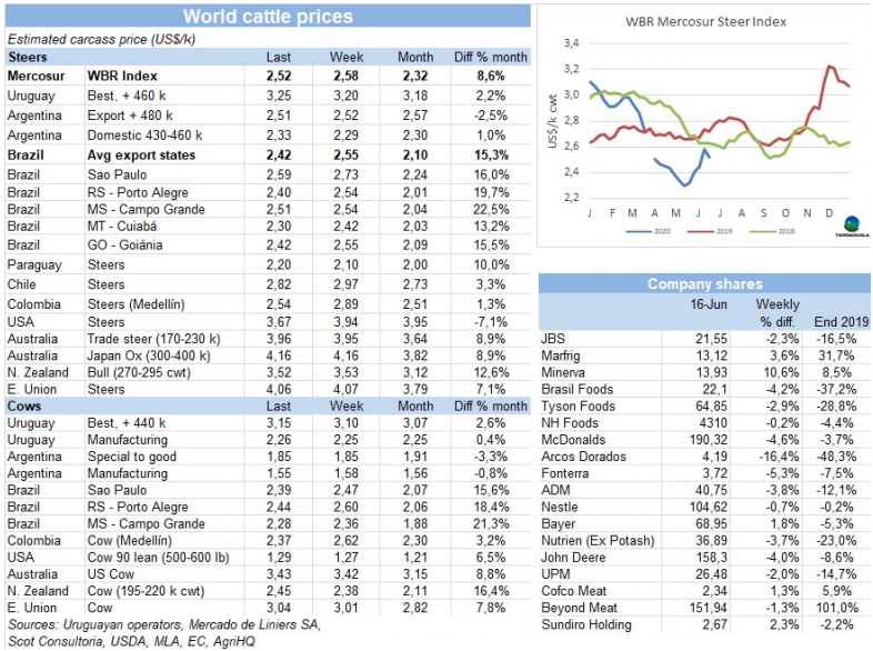 屠宰旺季和歐洲481配額的生產(chǎn)已經(jīng)過去,上周二,Marfrig停止了圣何塞的Inaler廠的屠宰活動(dòng)。知情人士透露,由于牛只供應(yīng)緊缺,而且中國市場正在對到港的所有集裝箱進(jìn)行新冠病毒檢測,Marfrig集團(tuán)正在研究關(guān)閉北部地區(qū)的工廠:Tacuarembo和Cledinor。Marfrig通常會(huì)在育成牛供應(yīng)較少的冬季間歇關(guān)閉工廠,給員工放假。