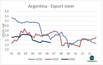 5月閹牛類型價(jià)值降低至1123美元,達(dá)2019年4月至今13個(gè)月以來最低。相反,閹牛采購價(jià)格上漲了52美元,增長至887美元,因此兩者之間的差即工業(yè)附加價(jià)值大幅下降,每屠宰一頭牛的工業(yè)附加價(jià)值下降236美元。烏拉圭肉協(xié)稱閹牛類型價(jià)值降低的原因是所有部位肉價(jià)格都有下降,出口方面,高價(jià)值的部位肉出口至歐洲市場困難導(dǎo)致價(jià)格下跌。國內(nèi)市場胴體、雜碎和副產(chǎn)品的美元價(jià)格也在下跌。閹牛類型價(jià)值是對一頭重480公斤,產(chǎn)量54%的英國品種閹牛?;螂s交品種的所有產(chǎn)品和副產(chǎn)品的貿(mào)易價(jià)值的加權(quán)平均值。