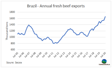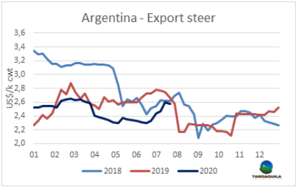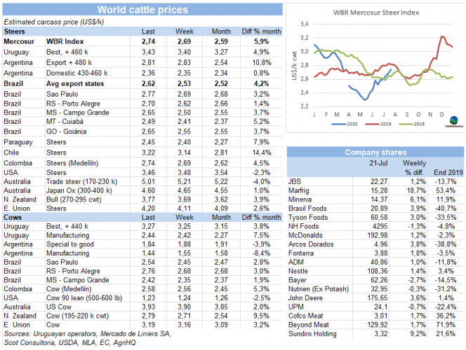 歐盟昨日宣布的大規(guī)模經(jīng)濟(jì)刺激計(jì)劃,以及新冠肺炎疫苗研制進(jìn)展的利好消息,帶動(dòng)了市場的樂觀情緒,推高了主要股指,新興國家貨幣也有升值。昨天巴西雷亞爾增值2.4%,較一周前增值3%,促進(jìn)牛價(jià)堅(jiān)挺。巴西主要出口州育成牛雷亞爾平均價(jià)格上漲了0.7%,美元價(jià)格上漲0.9美分,上漲至2.62美元/公斤。巴拉圭和烏拉圭牛價(jià)保持冬季一直以來的上行趨勢。巴拉圭閹牛報(bào)價(jià)2.45美元/噸,烏拉圭牛價(jià)要高出1美元,3.43美元/噸。阿根廷出口閹牛比索價(jià)格與上周保持不變,由于比索官方匯率珠江下跌,美元價(jià)格下跌2美分至2.81美元/公斤。南方共同市場活牛價(jià)格指數(shù)本周上漲5美分,上漲至2.74美元/公斤。