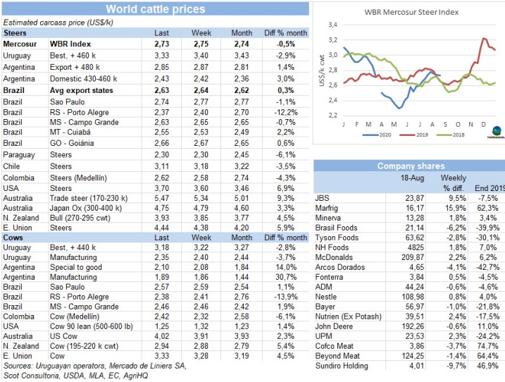 盡管今年這個時候草飼牛的供應接近為零,需求端仍集中精力在為481配額生產(chǎn),對其他類型的牛興趣極低。因此參考價再次下調(diào),預定期限拉長,大多數(shù)是九月第二周,配額生產(chǎn)快要完成的時候。有一些工廠不還價,另一些還價水平在閹牛3.3美元/公斤,母牛3.1美元/公斤,一些成交價比該參考價高一些,閹牛成交在3.35美元/公斤,母牛成交在3.15-3.2美元/公斤。今年疫情最嚴重的時候出現(xiàn)了特殊的情況,人們對體重輕的閹牛和國內(nèi)市場小母牛更感興趣,它們的價格與體重較重的牛相當,甚至略高,預定時間也可能更短。烏拉圭多個地區(qū),特別是北部地區(qū),人們對降水狀況越來越擔心,北部地區(qū)幾個月來沒有明顯的降雨記錄。預計從今天到周五還會有一股寒潮,伴有嚴重霜凍,甚至可能出現(xiàn)降雪。預計牛價的下行壓力將至少持續(xù)到9月初。工廠已經(jīng)訂購了配額開始完成的牛,因此,至少到那時候,預計不會出現(xiàn)根本的變化。
