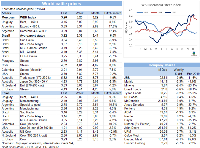 阿根廷牛價飆升,成為南美地區(qū)牛價最高的國家,這是自2017年至今三年來從未發(fā)生過的事情。本周育肥閹牛供應(yīng)短缺再次推高價格。包含出口稅的美元價格3.39美元/公斤,較上周上漲了8美分。烏拉圭閹牛價格也由于供應(yīng)短缺大幅上漲,本周成交價3.15美元/噸。恰恰相反,巴拉圭和巴西的牛價下行,本周巴西牛價按雷亞爾計下跌了5%,雷亞爾0.7%的升值部分抵消了雷亞爾價格的下行。巴西中央銀行表示,即將放棄將參考利率保持在最低水平的承諾,目前美元雷亞爾匯率為5.育成牛平均價格本周下跌了14美分至3.22美元/公斤。巴拉圭方面育成牛價格下跌至2.7美元/公斤。因此,南方共同市場閹牛價格指數(shù)下跌了5美分,下跌至3.2美元/公斤。