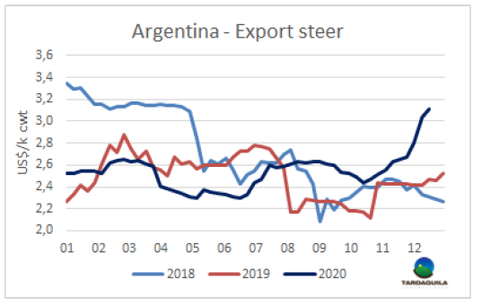 新的一年阿根廷將獲得2021年在美國市場2萬噸的肉類免稅配額,這些配額按照“先到先得”的原則分配。因此,被批準出口至美國的肉類加工商已經(jīng)準備向美國出口肉類,在其他市場,尤其是歐盟市場波動之際,這是一個很好的補充。據(jù)了解,后部位肉的售價在5500-5800美元/噸,還有一些西冷,由于歐盟市場的反彈,西冷價格將會上漲。