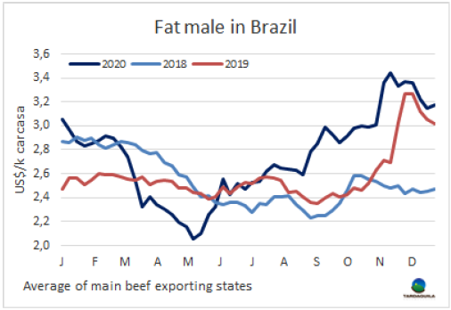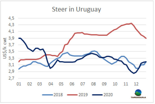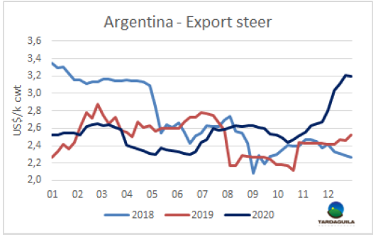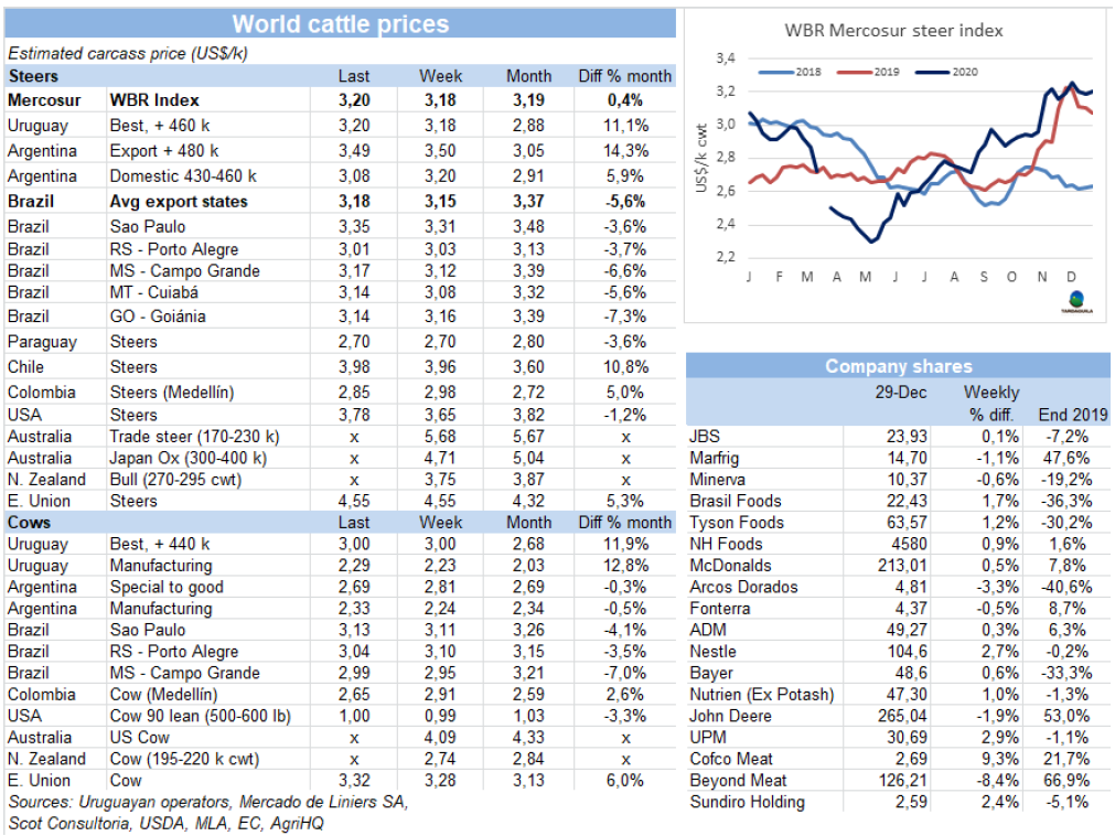 本周南方共同市場(chǎng)閹牛價(jià)格以上漲結(jié)束了2020年的走勢(shì)。本周價(jià)格上漲了2美分,上漲至3.28美元/公斤,較本年度價(jià)格最高點(diǎn)僅相差5美分(12月初時(shí)),較5月南美地區(qū)疫情最嚴(yán)重時(shí)牛價(jià)最低點(diǎn)高90美分(39%)。本周南美牛價(jià)指數(shù)上漲主要由于巴西和烏拉圭牛價(jià)上漲,本周巴西育成牛價(jià)格上漲了4雷亞爾,上漲至248雷亞爾/15公斤,結(jié)束了前幾周的下行趨勢(shì),由于雷亞爾貶值,美元價(jià)格漲幅較小,美元牛價(jià)上漲了3美分至3.18美元/公斤。烏拉圭由于供應(yīng)減少,特種閹牛價(jià)格上漲了2 美分,上漲至3.2美元/公斤。阿根廷方面前幾周市場(chǎng)堅(jiān)挺,本周趨于平穩(wěn),由于阿根廷比索貶值蓋過(guò)了本地牛價(jià)的上漲,出口閹牛價(jià)格下跌了1美分至3.49美元/公斤。巴拉圭市場(chǎng)活牛價(jià)格連續(xù)第三周保持平穩(wěn),保持2.7美元/公斤。