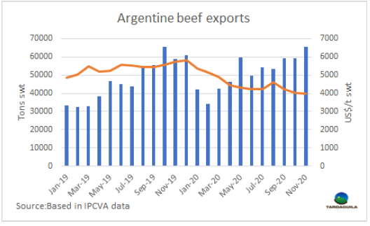 根據(jù)阿根廷牛肉推廣局發(fā)布的報(bào)告,11月冰鮮牛肉、冷凍牛肉及其加工產(chǎn)品出口量總計(jì)65757噸,達(dá)十年以來(lái)最大,出口額達(dá)2.616億美元。這些數(shù)字意味著出口量與2019年11月相比增長(zhǎng)11.4%,出口額下降了22.6%。該差異產(chǎn)生的原因是11月平均出口價(jià)格較去年同期降低了30.5%,11月冰鮮去骨牛肉平均出口價(jià)格達(dá)近6250美元/噸。冷凍去骨牛肉平均價(jià)格4000美元/噸,同比分別下跌了22.7%和27.4%。平均出口價(jià)值自2009年以來(lái)首次降至每噸4000美元以下,達(dá)整個(gè)南美地區(qū)最低。市場(chǎng)分析師Ignacio Iriarte告訴記者,以同等胴體重量計(jì)算的月出口量和年出口量記錄是90多年來(lái)最高的。