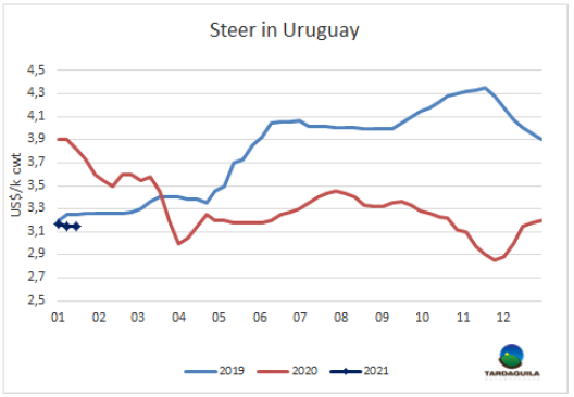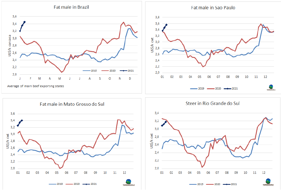 最近的降雨使報盤冷靜下來,市場找到了平衡。預定時間縮短,價格保持在上周的水平。育肥牛市場參考價保持與上周相近,但成交緩慢,預定時間拉長。預訂時間7-10天。特種閹牛參考價3.15美元/公斤,45天付款。母牛2.95美元/公斤,小母牛3-3.05美元/公斤。有個別成交可能高幾美分。市場上有人稱,上周有些工廠試圖保持采購價格下降的趨勢,閹牛想還3.1美元/公斤沒有買到。一些地區(qū)降雨鞥豐富給生產(chǎn)者帶來了平靜。預計下周二至周四將有更多降雨,因此1月結(jié)束時的降雨量將超過預期。預計市場將保持在目前的價格水平,除了從下周開始,一些工廠將開始進行481配額窗口的屠宰,其產(chǎn)品將從4月1日起進入歐洲市場??紤]到481配額的生產(chǎn)都是自養(yǎng)的?;蛞呀?jīng)獲得了牛源,481配額的集中生產(chǎn)減少了現(xiàn)貨市場上的購買壓力。