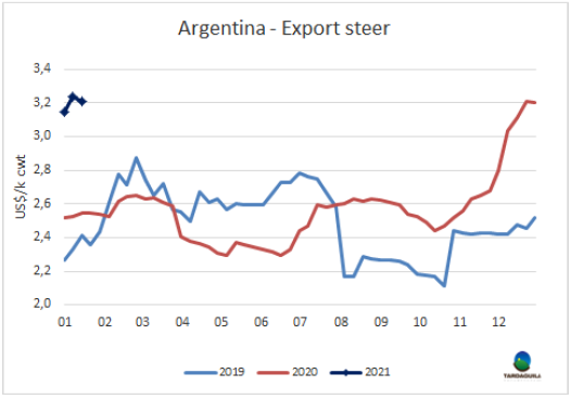 阿根廷政府在2020年最后一天宣布的為期兩個月的玉米出口禁令后取消了這一決策,改為限制每日3萬噸的出口配額,之后政府也取消了這一限制措施。然而,對于出口的擔憂仍然存在。今年是選舉年,政府將特別關(guān)注牛肉價格,在當前通貨膨脹的背景下,牛肉價格嚴重影響消費者價格指數(shù)在阿根廷人的文化中根深蒂固。與政府關(guān)系非常密切的經(jīng)濟學家們認為,必須通過加征出口稅將國內(nèi)價格與國外價格脫鉤,以至于與總統(tǒng)關(guān)系密切的副總統(tǒng)Fernanda Raverta稱阿根廷存在“出口食品的詛咒”。