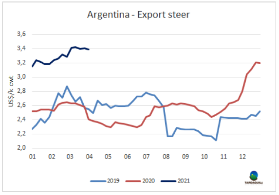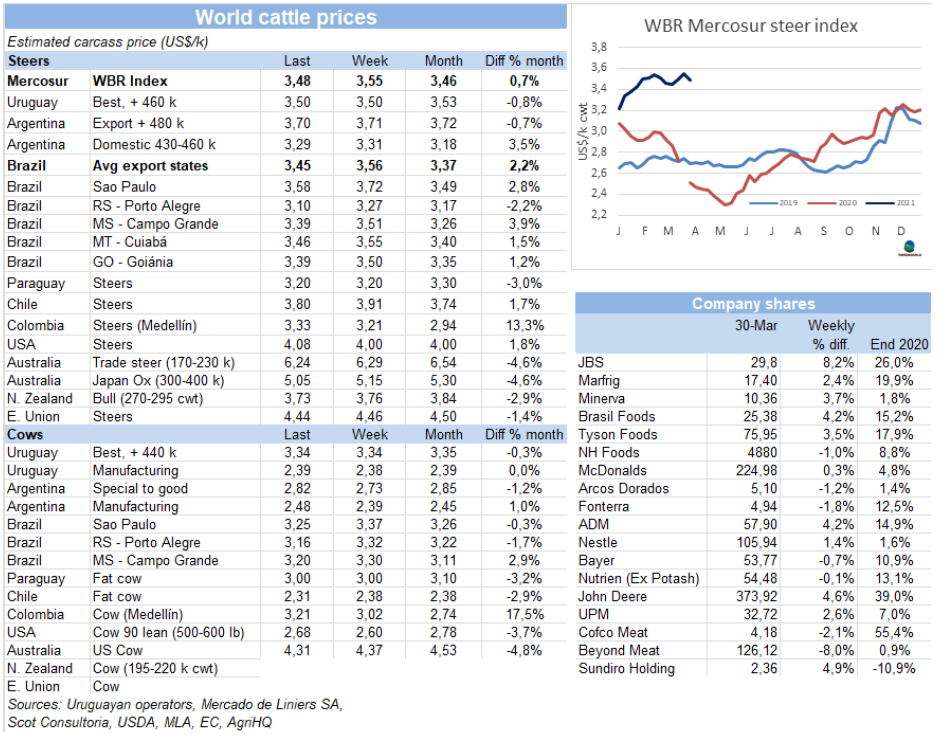 對于疫情發(fā)展的擔憂和巴西內(nèi)閣部長的換屆給巴西貨幣價值造成影響。巴西雷亞爾較美元貶值了4.4%。因此盡管巴西按雷亞爾計的育肥牛價格繼續(xù)上漲,轉(zhuǎn)換成美元價格后本周下跌了11美分至3.45美元/公斤。本周其他地區(qū)牛價保持不變。南方共同市場牛價下降了7美分至3.48美元/公斤。