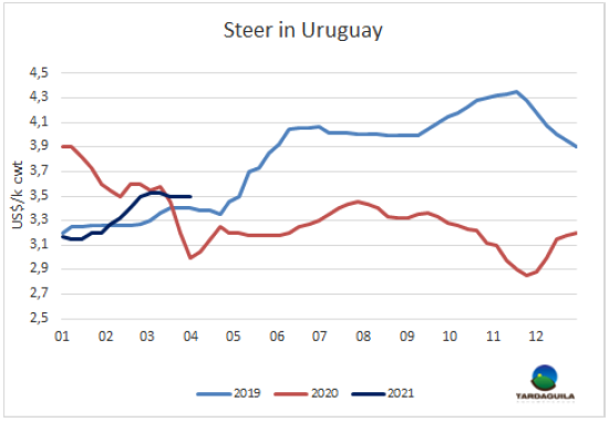育成閹牛的價格下行持續(xù)時間很短,最近降雨雖然不大,但供應端不急出售。參考價與上周相同,特種閹牛3.5美元/公斤,重型母牛3.3美元/公斤,45天付款包含運費。對母牛的采購興趣要強于閹牛,因為母牛的生產(chǎn)主要是面向中國市場,而歐洲市場非常低迷,猶太屠宰團隊也沒有開工。期貨的預定時間在一周左右。烏拉圭新冠病例不斷增長迫使工廠不得不充分利用工作日全面生產(chǎn),因為一旦有工廠發(fā)現(xiàn)新冠病例工廠將停工數(shù)日。由于目前的供應相對于需求仍處于短缺狀況,預計復活節(jié)周之后市場將恢復堅挺。