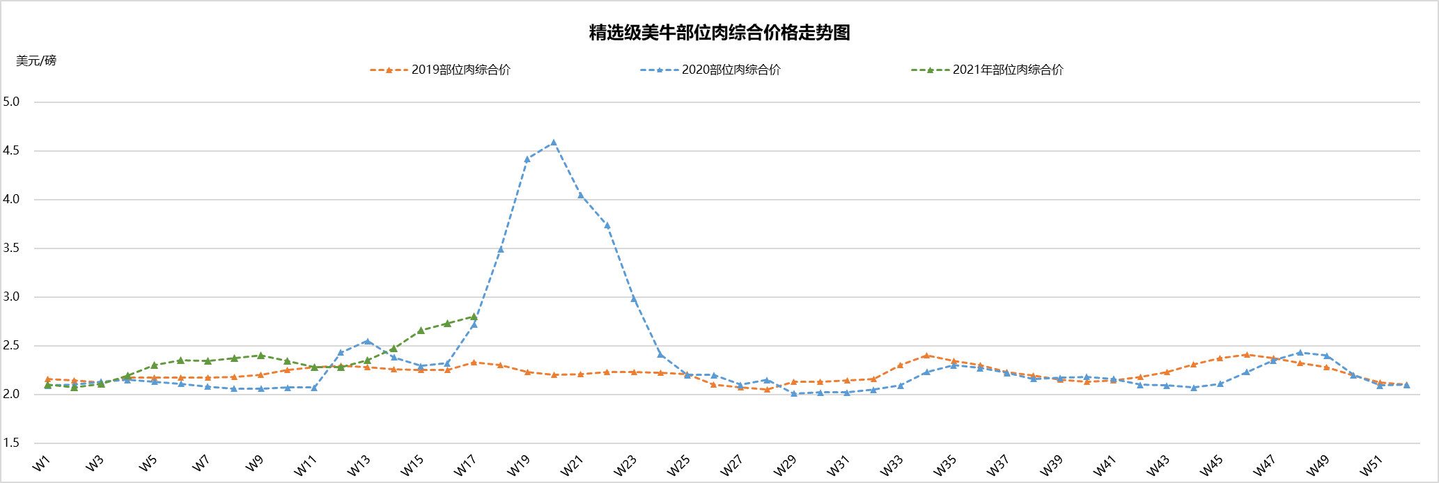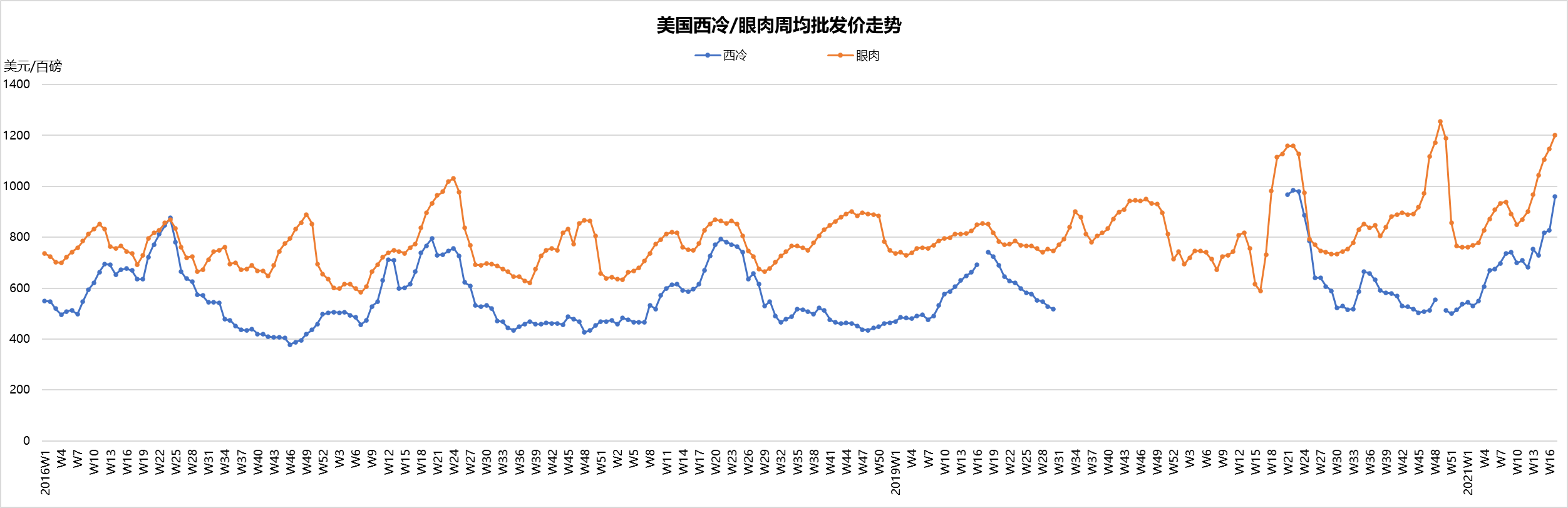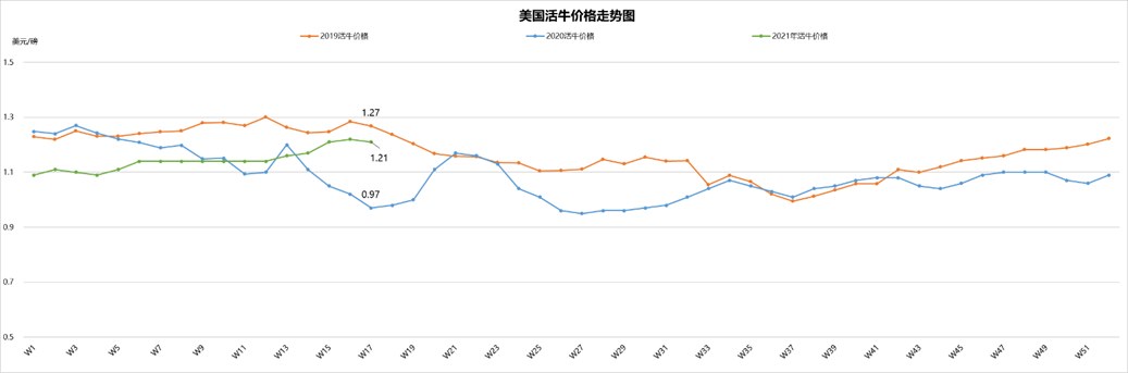 最近兩周美國活牛價(jià)格穩(wěn)中微跌,本周活牛價(jià)格1.21美元/磅。盡管批發(fā)市場牛肉價(jià)格不斷上漲,但育肥場充足的供應(yīng)和工廠的產(chǎn)能限制仍然是制約活牛價(jià)格上漲的兩個(gè)主要原因。