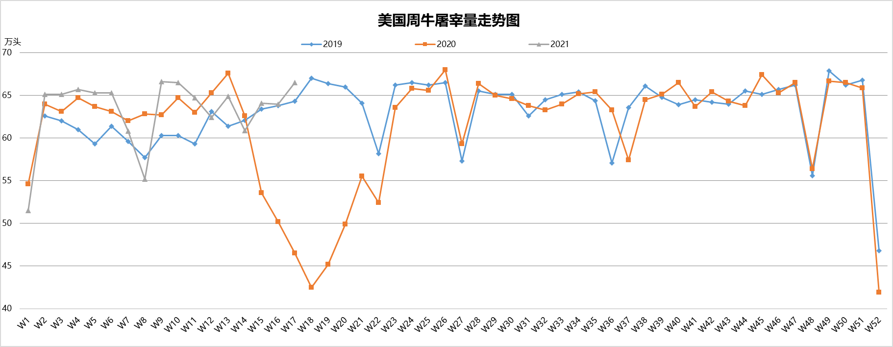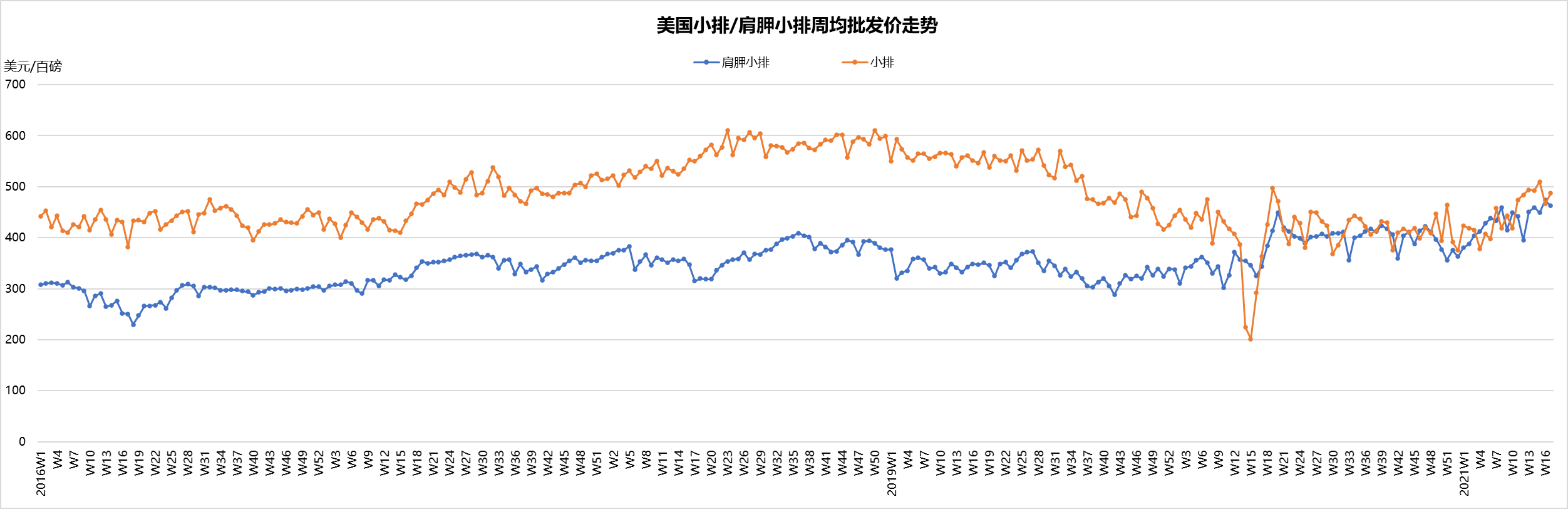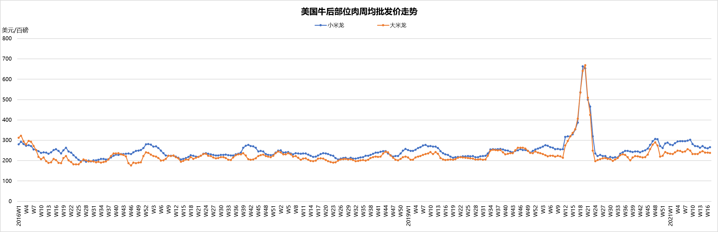 最近兩周美國活牛價(jià)格穩(wěn)中微跌,本周活牛價(jià)格1.21美元/磅。盡管批發(fā)市場牛肉價(jià)格不斷上漲,但育肥場充足的供應(yīng)和工廠的產(chǎn)能限制仍然是制約活牛價(jià)格上漲的兩個(gè)主要原因。