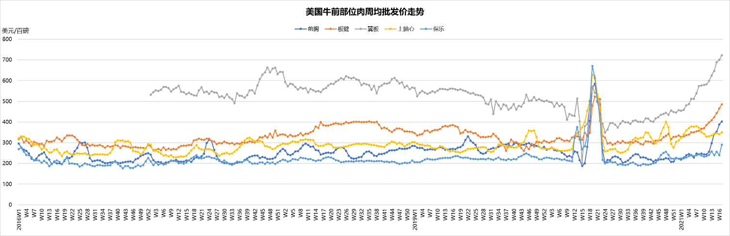 4月部位肉批發(fā)價(jià)保持堅(jiān)挺,精選級(jí)部位肉綜合價(jià)2.8美元/磅,較上周增長了2.5%,較去年同期上漲了2.9%。去年受疫情影響部位肉批發(fā)價(jià)急劇上漲。餐飲的復(fù)蘇是最近部位肉價(jià)格上漲的主要原因。