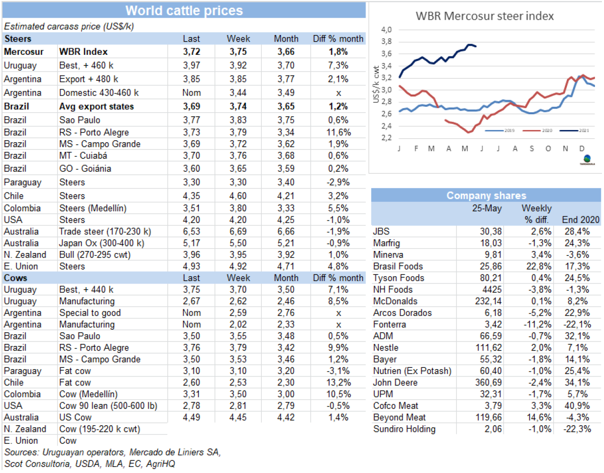 Minerva在烏拉圭3家工廠中的兩個,Pulsa(7廠)和Carrasco(3廠)再次獲批可以對美國出口鮮肉。此前美國農業(yè)部/FSIS衛(wèi)生當局制定暫停對美出口措施,自2020年8月至9月生效。從那時起,為迅速恢復商業(yè)聯(lián)系,兩國衛(wèi)生部門之間開始信息和文件交流。預計在2020年底收到的恢復消息終于于今年五月20日收悉。