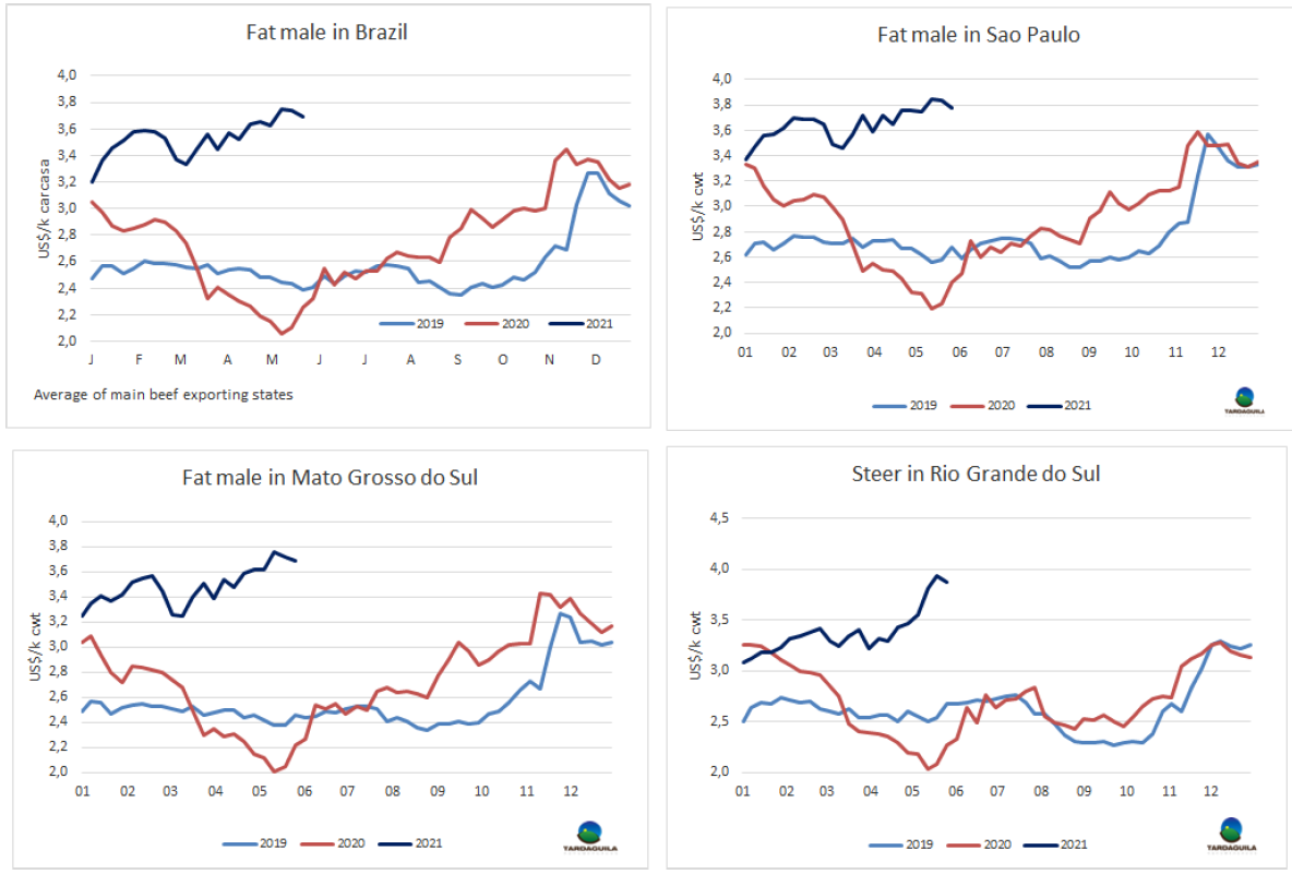 自2018年七月起,巴西牛肉月出口量連續(xù)34個月超過10萬噸。在此之前,月出口量超過10萬噸連續(xù)最長的階段是自2006年5月至2007年6月的連續(xù)14個月。據分析,這是強勁的國際市場需求所導致的,尤其是來自中國的需求。巴西的產能無法跟上日益增長的需求,帶來的結果則是待宰牛、架子牛和國內市場牛肉價格的持續(xù)上漲。2018年7月育肥牛平均價格209雷亞爾/15公斤,2018年年末育肥牛價格上漲至219雷亞爾/15公斤。2019年年初育肥牛參考價220雷亞爾/15公斤,2020年育肥牛價格達300雷亞爾/15公斤。2021年前5個月育肥牛價格達310雷亞爾/15公斤,今年年底到期的期貨合約價格將達約330雷亞爾/15公斤。