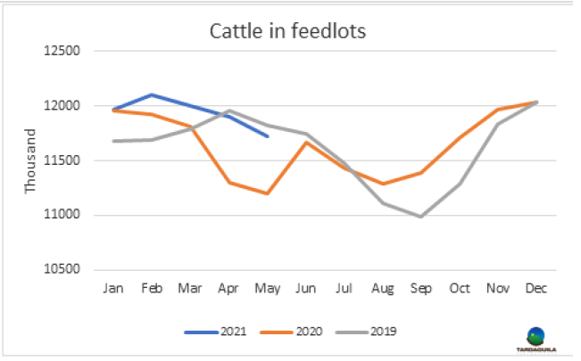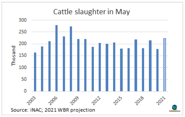 上周牛屠宰量再次增長,烏拉圭肉協(xié)報告統(tǒng)計,上周屠宰量55712頭,較前一周增長了2000多頭,達今年周屠宰量的第二高。較去年同期增長了超過10000頭。隨著歐洲481配額的生產全面打開,閹牛屠宰量達29938頭,達2018年3月第三周至今三年多以來最大,同樣,小母牛屠宰量達6263頭,達3月第一周以來最大。相反,母牛屠宰量下降至18598頭,較上周下降了2432頭。屠宰量最大的工廠是Athena-Pulsa(4956頭),Las piedras(4532頭),Athena-Canelones(4476頭)。本周Athena三家工廠屠宰總量13639頭,Marfrig四家工廠屠宰總量13772頭,日資企業(yè)BPU上周五進行了最后一次屠宰活動,本周暫未開始屠宰,還在等待中國市場的重新準入。截止5月22日,牛屠宰量達160548頭,較2020年同期增加了15575頭,約增長了20%。如果不出現疫情相關的重大問題,五月屠宰量將超過22萬頭,達10年以來最高。 5月也將成為連續(xù)第八個屠宰量高于去年同期的月份。