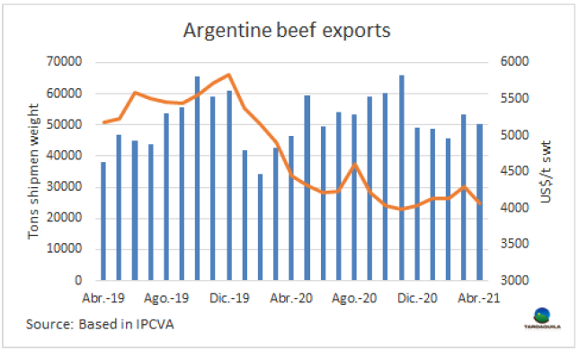 據阿根廷牛肉推廣局發(fā)布的報告,4月阿根廷牛肉出口量50150噸(約70000噸胴體重量),出口額2.042萬美元,不包括牛副產品。4月出口量較上月下降了6.3%,但仍較2020年4月增長了8.4%,。出口額較3月下降了11.2%,較2020年4月下降了0.6%。4月出口額中有23.5%來自于并冰鮮部位肉,占出口量的14.4%,包括希爾頓冰鮮產品。冷凍產品在出口額中占比達65.3% ,占出口量的65.5%,主要去往中國市場的帶骨產品占出口額的11%,占出口量的19.7%。2021年第一季度阿根廷出口總量198143噸(胴體重量約28萬噸),較2020年同期增長了20%,第一季度出口額約8.25億美元,較去年同期沒有變化。