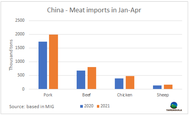 據梅特國際集團發(fā)布的數據,2021年前四個月中國牛肉進口量達350萬噸,較2020年同期增長了50萬噸,增長了17%。貿易的增長主要體現在四種主要肉類上。今年年初羊肉產量很低,現在已經回升,比去年同期增長了28%,在四個月的時間里增加了17.4萬噸。今年4月,中國進口羊肉5.04萬噸,比2020年同月增長了37%。主要進口肉類仍是豬肉進口量達200萬噸,同比增長了15%,牛肉進口量81.5萬噸,同比增長了19%,雞肉進口量48.8萬噸,同比增長了21%。