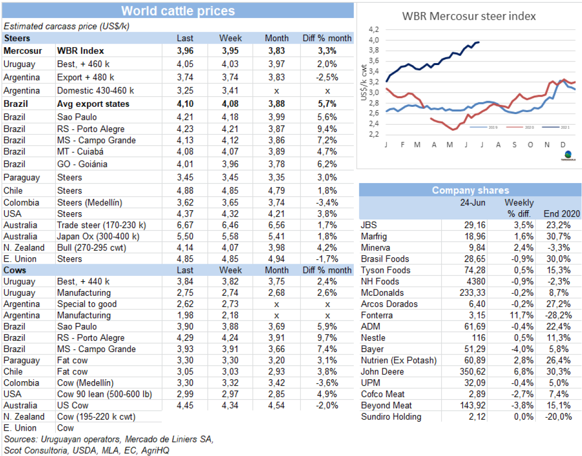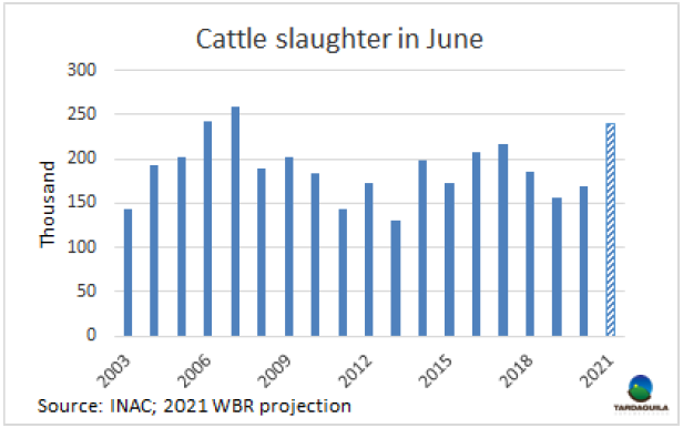 上周牛屠宰量再次增長(zhǎng),據(jù)烏拉圭肉協(xié)報(bào)告統(tǒng)計(jì),截止6月26日的一周,屠宰量56395頭,較上周增長(zhǎng)了8000頭,較去年同期增長(zhǎng)了18000頭。這是今年屠宰量第三大的一周。盡管481配額的屠宰結(jié)束,燕麥飼養(yǎng)的牛出欄延期,但采購(gòu)需求堅(jiān)挺帶動(dòng)屠宰量增長(zhǎng),所有種類的牛,無(wú)論好壞,都被買走了。本周屠宰量增長(zhǎng)最大的是閹牛,本周增加了4301頭至25530頭(+20.3%),母牛屠宰量增加了3181頭至23214頭,小母牛屠宰量增加了457頭,至6250頭。屠宰量最大的工廠是Tacuarembo(4718頭),Ontilcor(4469頭),Las Piedras(4385頭)。Marfrig四家工廠屠宰總量14380頭, Athena三家工廠屠宰總量12164頭。據(jù)本月結(jié)束僅剩3個(gè)工作日,六月屠宰量已達(dá)208093頭,本月屠宰量將超過(guò)24萬(wàn)頭,較2020年六月約增長(zhǎng)7萬(wàn)頭,是6月屠宰量第三大的年份,僅次于2006年和2007年。今年前半年牛屠宰量將達(dá)124萬(wàn)頭,較去年增長(zhǎng)了29.1萬(wàn)頭,增長(zhǎng)了31%。