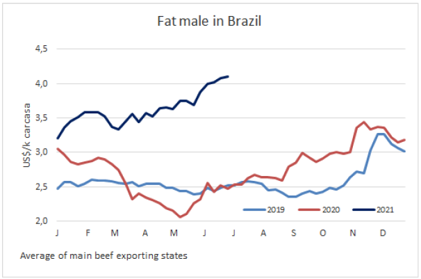 本周育肥牛市場(chǎng)保持堅(jiān)挺,價(jià)格變化不大。隨著活牛運(yùn)輸旺季到來(lái),供應(yīng)仍然吃緊。然而需求端試圖減少采購(gòu)來(lái)對(duì)抗這一情況,使價(jià)格不再繼續(xù)攀升。圣保羅州的平均價(jià)格與上周保持同一水平,銷售到國(guó)內(nèi)市場(chǎng)的育肥牛價(jià)格在310雷亞爾/15公斤,用于出口的育肥牛價(jià)格要高7雷亞爾。戈尼亞、米內(nèi)羅三角洲等地牛價(jià)有上漲,其他地區(qū)如大坎波、庫(kù)亞巴、隆多尼亞牛價(jià)有輕微上漲。批發(fā)市場(chǎng)周末的牛肉銷售不佳,但預(yù)計(jì)接下來(lái)幾天,受月初效應(yīng)影響牛肉銷售將有好轉(zhuǎn)。本周期貨市場(chǎng)育肥牛價(jià)格下跌,尤其是九月合同直至年末。這是由于巴西雷亞爾升值以及Guedes部長(zhǎng)關(guān)于巴西貨幣有更多升值空間的預(yù)期,給出口商造成壓力,導(dǎo)致的出口平衡惡化。